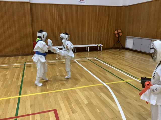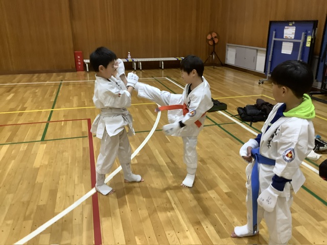 スパーリングではミンハちゃんが、タクミ君をKO。中段前蹴りが入りました。素晴らしい!試合が近くて気合いが入ってるね。最も、タクミ君が手加減して油断していたせいもあります。本気でやったら、タクミ君が問題なく勝ちます。しかし、タクミ君、油断しちゃダメだぜ!