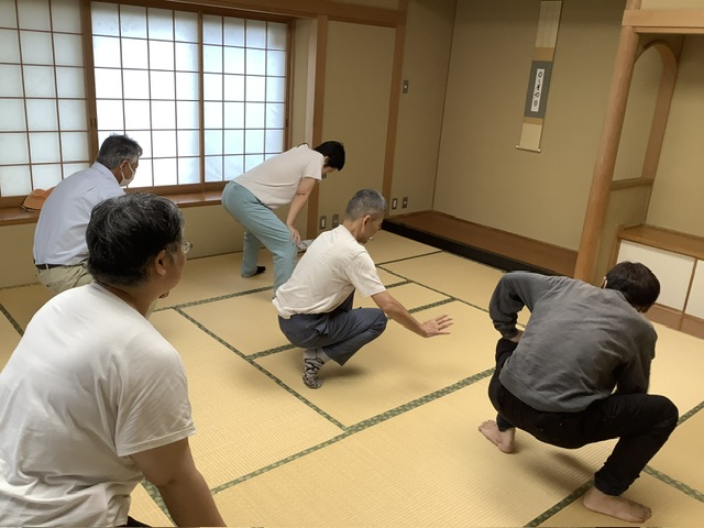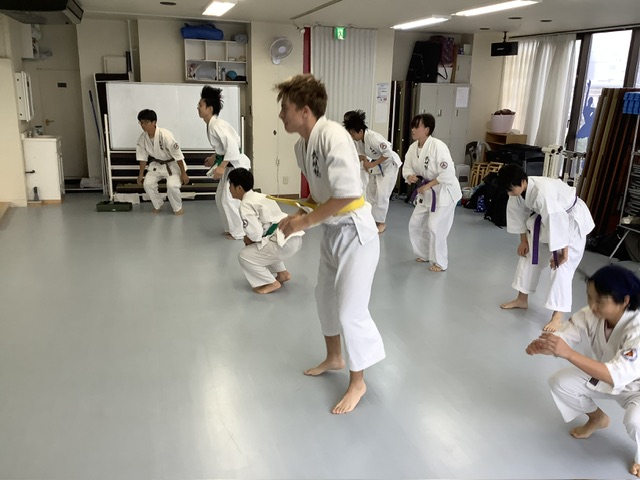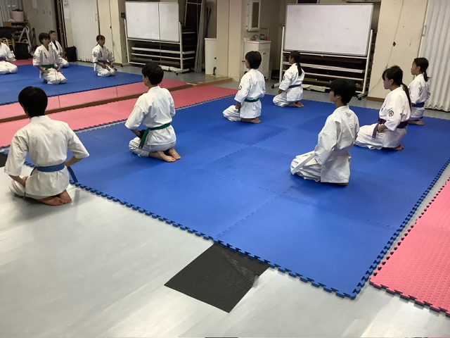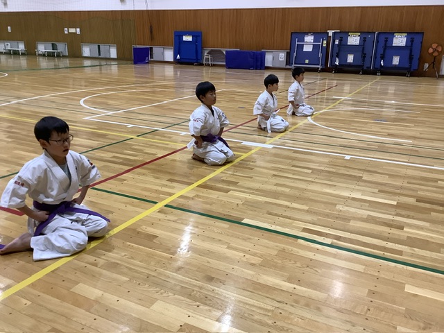 最後の体力補強トレーニングは股関節の柔軟も兼ねた、ワイド・スタンスでのスクワット20回。それとジャンピン・スクワット30回。そして、先の不合格2人に関しては掃除後に拳立てを30回の号令の内、何回出来るか?をやらせました。来週にはキッチリ出来るようにしておけよ!