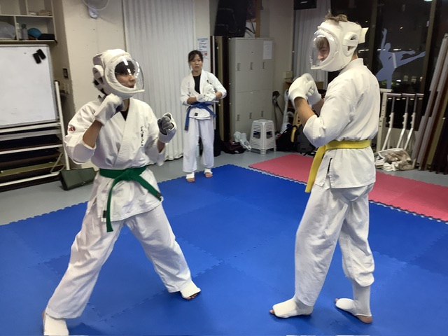 写真はスパーリング。アカリちゃんとアレク君。アカリちゃんは私の身長を超えましたが、アレク君とはこの差です(~_~)