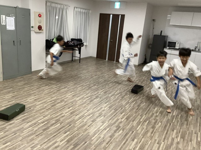 稽古前。グルグル鬼ごっこする子供達。稽古前には、大人だったら体力温存の為にやりません。やったら本当にキツイんです。けど、凄く良いトレーニングなんですけどね。