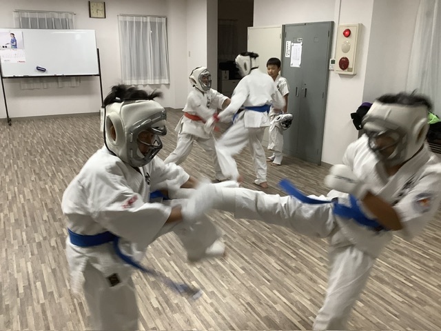 手前、左はヒロ君?良い前蹴りみたいだけど、間合いがちょっと…。惜しい!