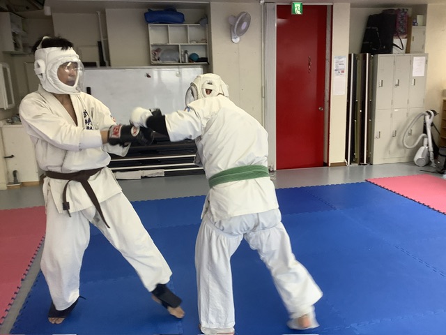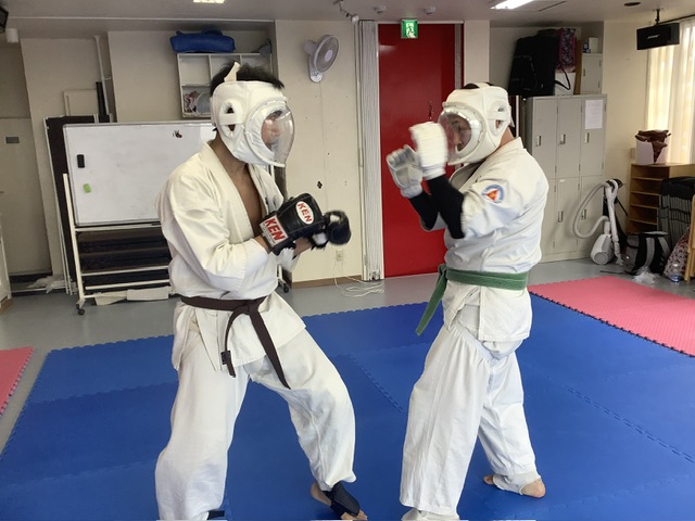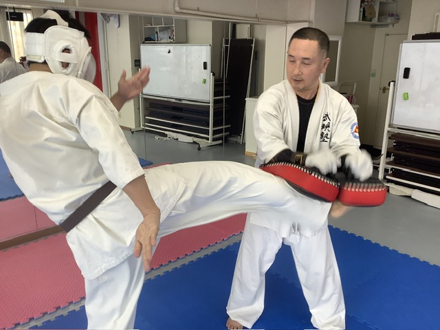 基本稽古、移動稽古の後は私が2人のミット持ち。体がしっかりと温まった後に組手稽古。