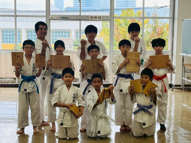演武会では全員、ノーミス。型演武では、最後に少年部上がりのソウゴ君、ヨシヒサ君にやって貰いました。型専門の方から見たら、まだまだでしょうが、型を専門に稽古していない我々にしては綺麗に決まっていました。良かったと思います。試し割りではこれも全員 正拳突きで割れました(^^♪ 良かったね\(^o^)/