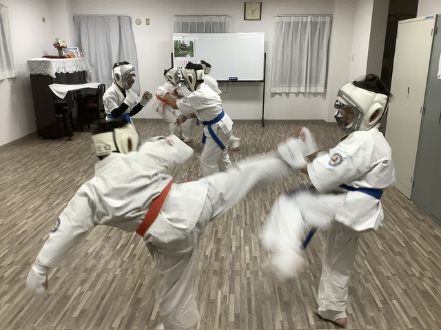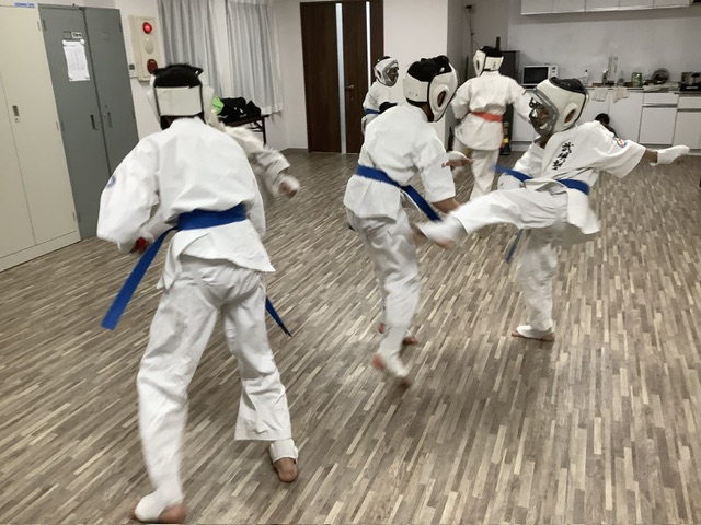 組手稽古。ここからは新人の2人は見学です。スパーリング。