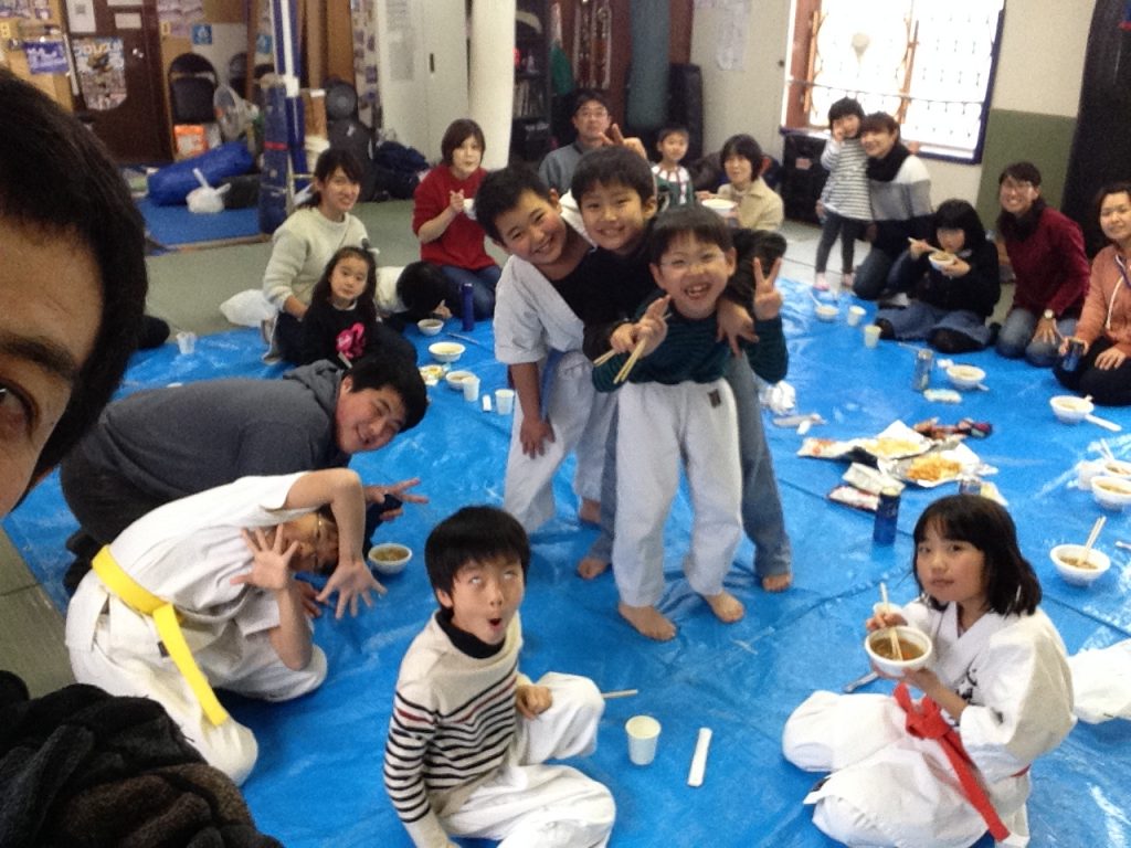 以前は、こんな感じで子供、保護者を交えた親睦会でした。道場なので良かったんですけどね。中央でピース出しているのが現在 高校生のヨシヒサ君(ヒロハル君のお兄ちゃん)です。2018年1月の写真です。
