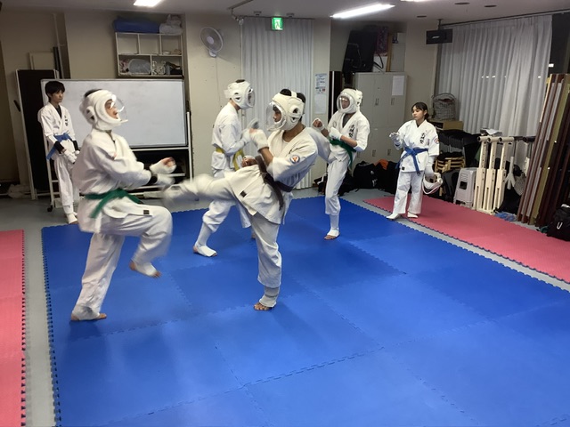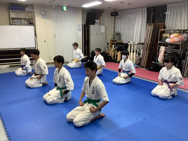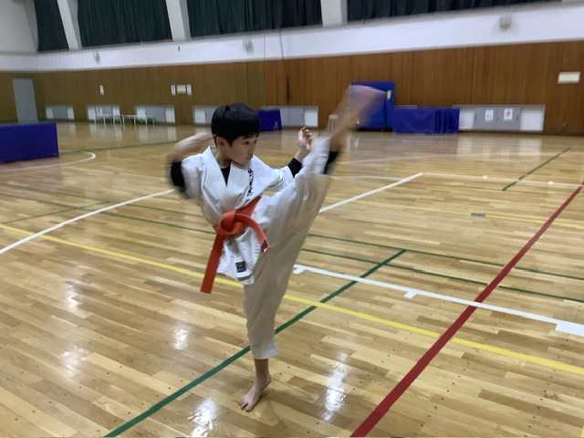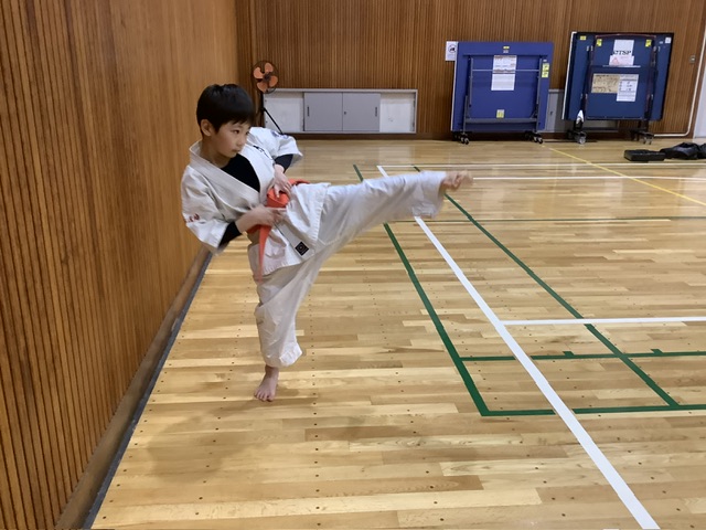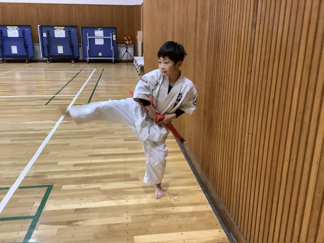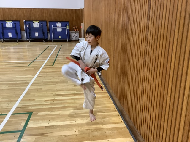 基本稽古では壁に手を添えて回し蹴りをやった後に横蹴りをやらせました。写真は鶴足立ち。