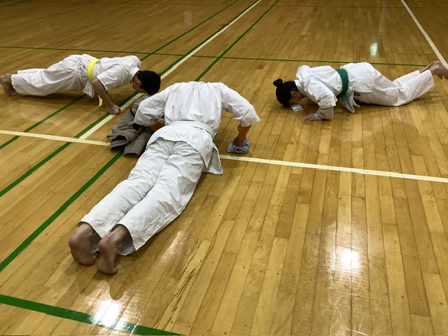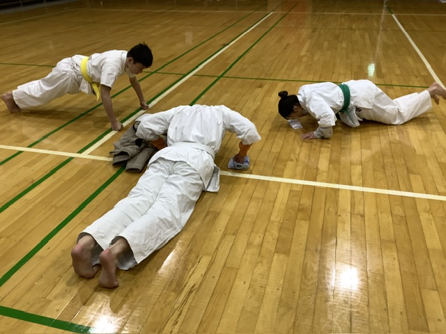 基本稽古、移動稽古、型稽古が終わり、体力トレーニング。ヒンズースクワット100回をやってからこちらの拳立て。