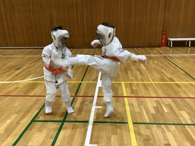 コウタ君とルイ君。コウタ君の左上段回し蹴り。ルイ君、ちゃんとガードを上げとけよ!