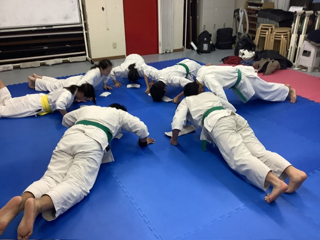 最後はジャンピング・スクワット30回、腹筋50回、背筋10回、兼立て(女子は腕立て伏せ&膝付き)50回を出来る範囲で。ホノカちゃんは腕立て伏せだけ参加。それまではサンドバッグの蹴り込み。