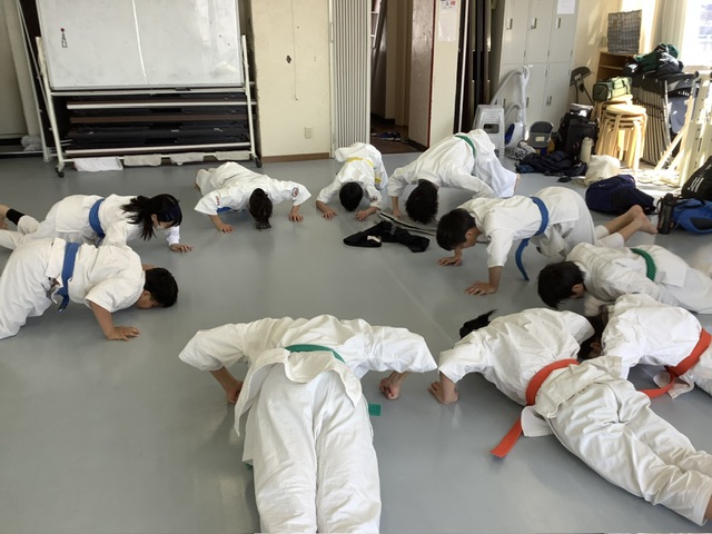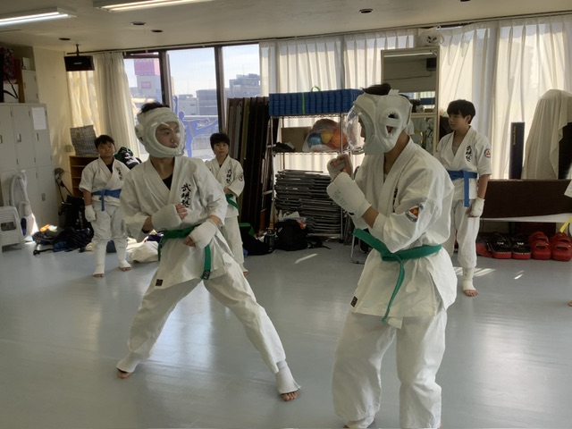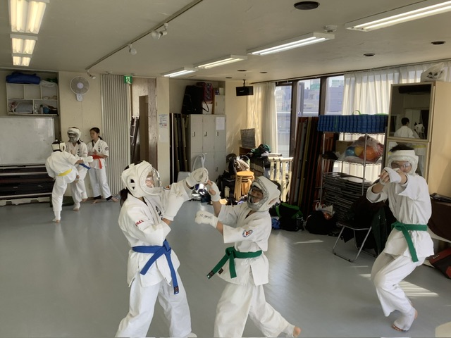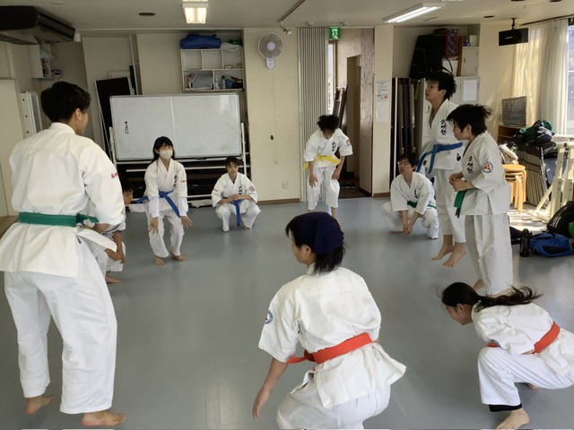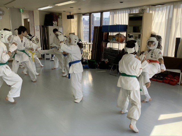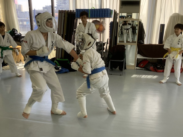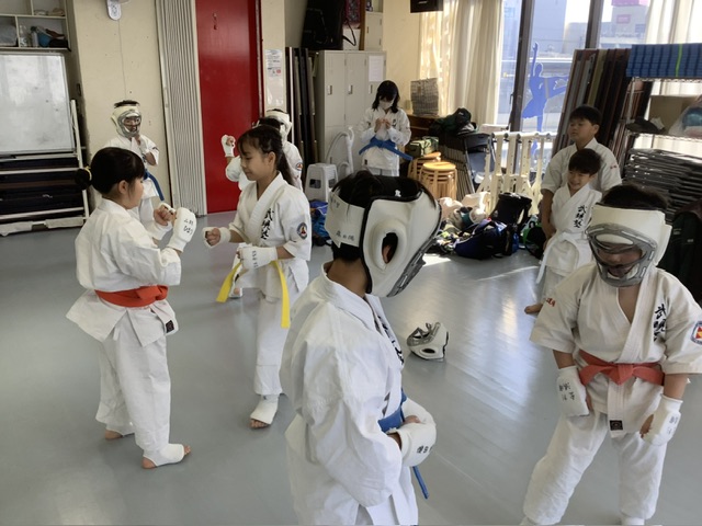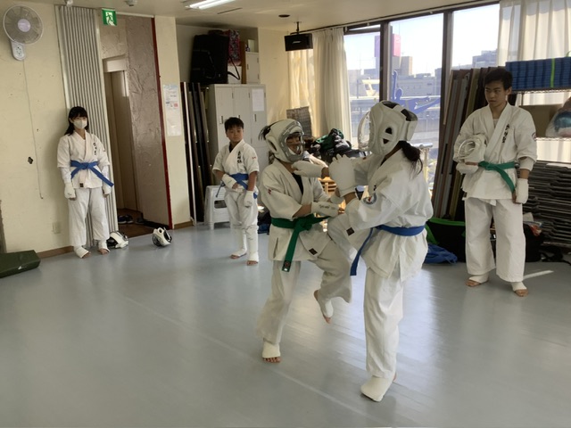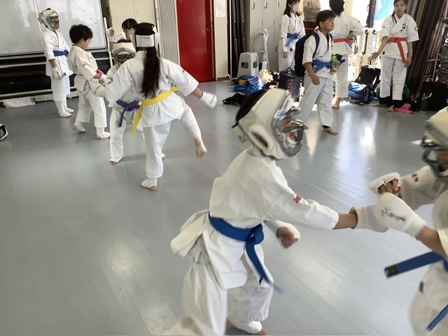 2部、型稽古後にスパーリング。手前はアヤちゃんとホノカちゃん。