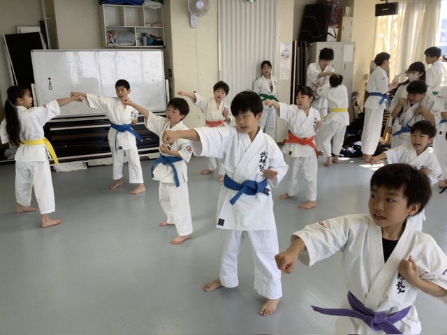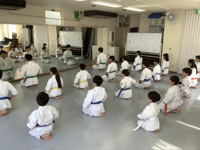 合同基本稽古後、1部の子のみで〆の上段突き。後ろでヨシヒサ君、遊ぶなよ!
