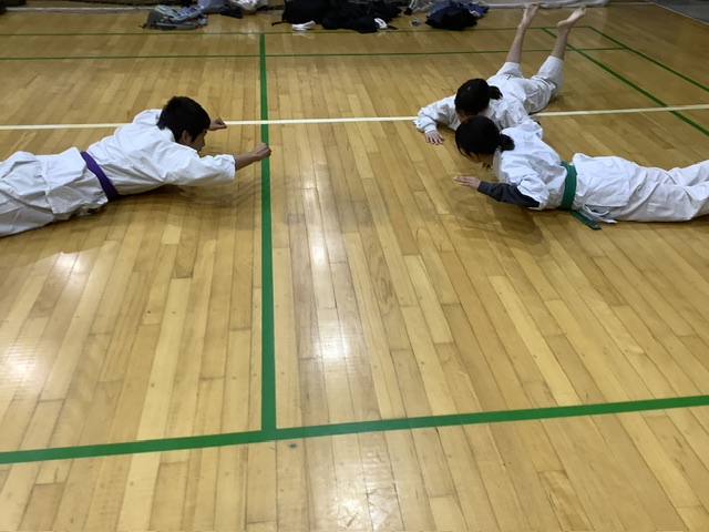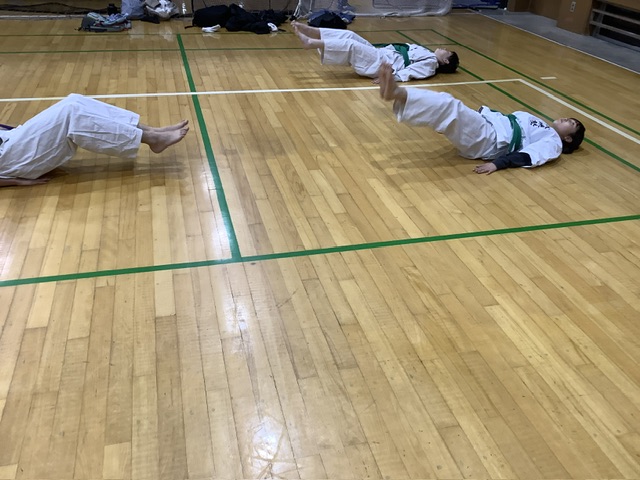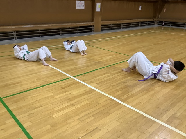 移動稽古後は体力補強トレーニング。ジャンピング・スクワットを30回やり、腹筋。