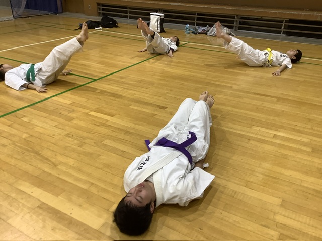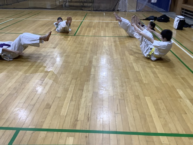 その後、蹴りの移動稽古をやり、体力補給トレーニング。ジャンピング・スクワット30回、上部のみの腹筋、V字腹筋、足上げ腹筋、背筋、腕立て伏せを行いました。