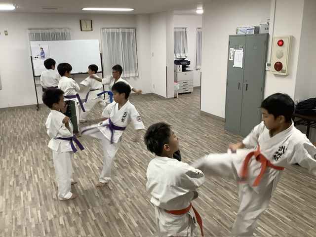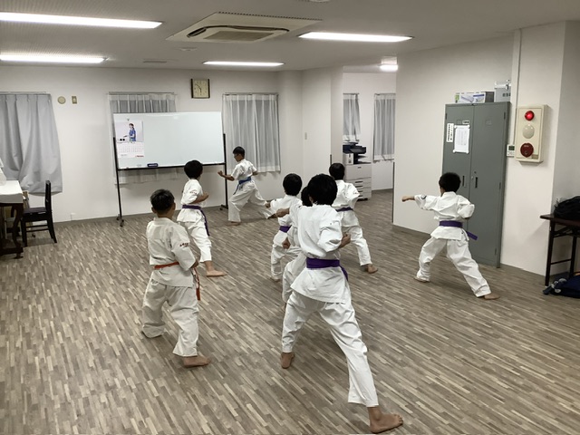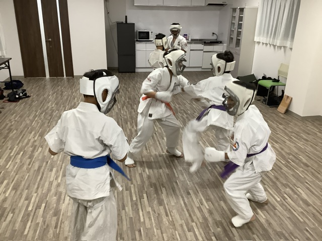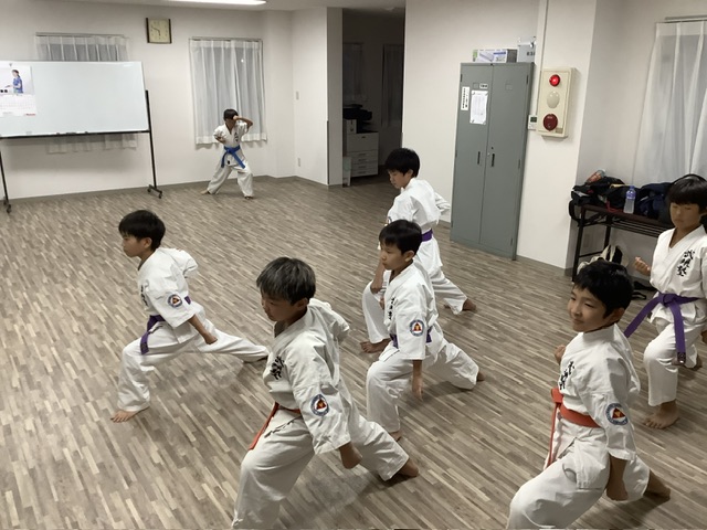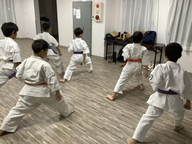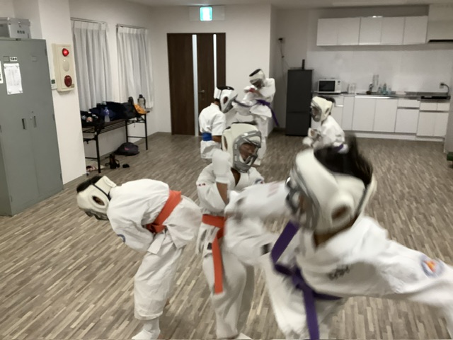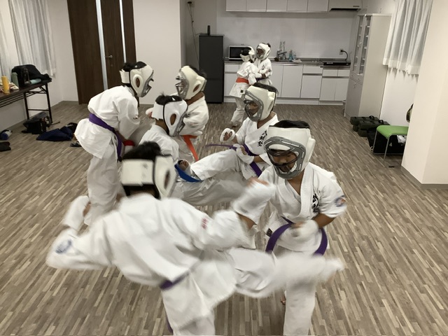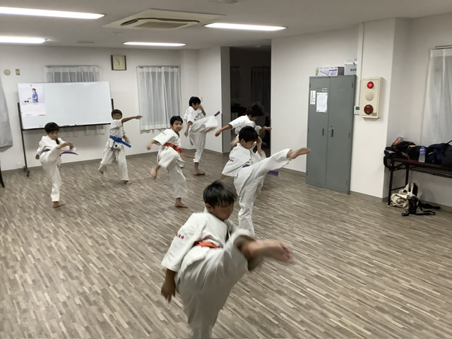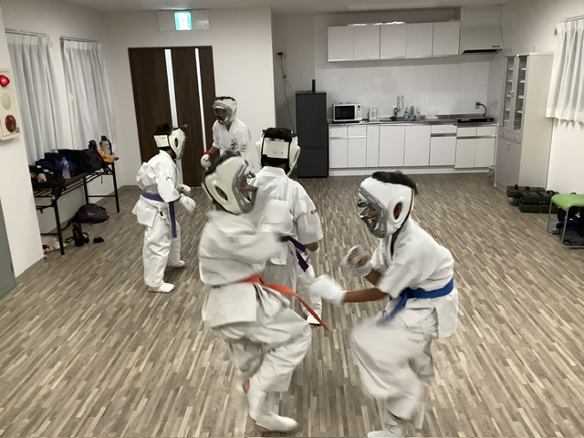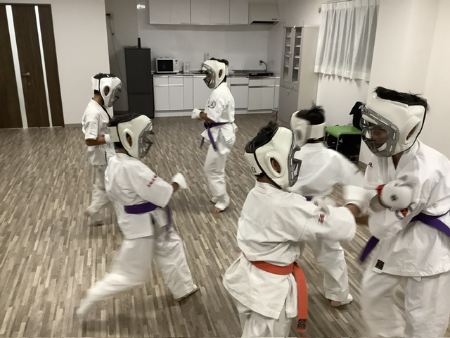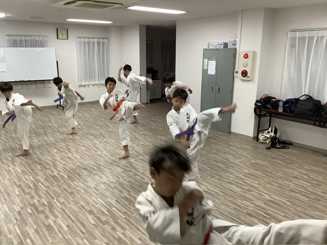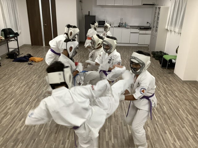 ランニングと手技の基本稽古は野外。その後、低音サウナ状態の体育館へ移動。足技の基本稽古が終わると型稽古。後ろ脚を伸ばせー!