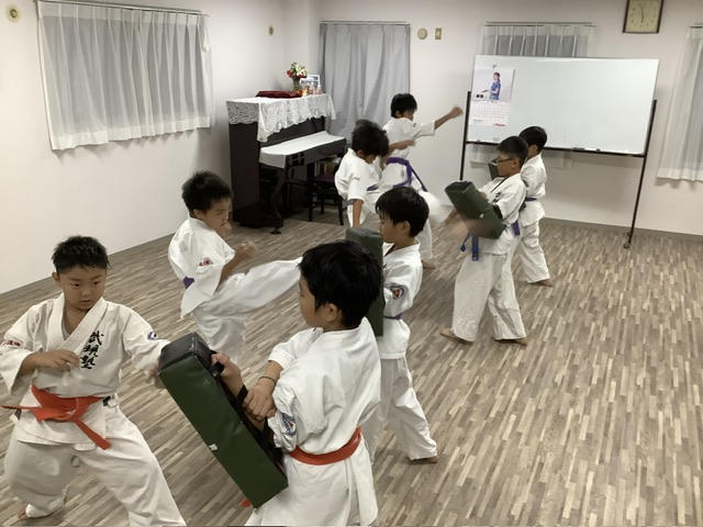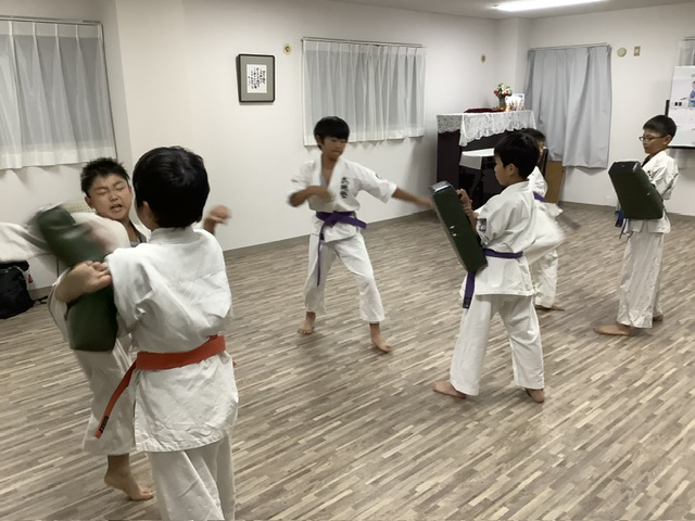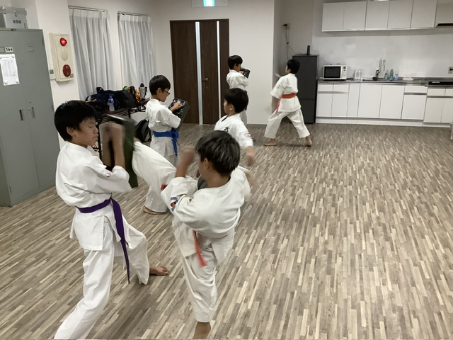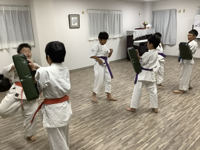 キックミット。手前のコウキ君は回し蹴りが上手です。この写真では蹴りのモーション途中に関わらず骨盤が回ってます。軸足が回ってます。帯の結び目がこちらに向いているのです。