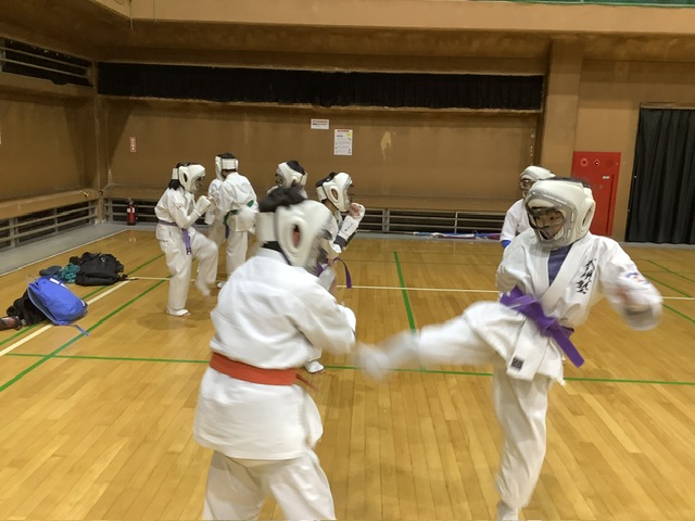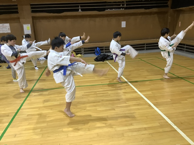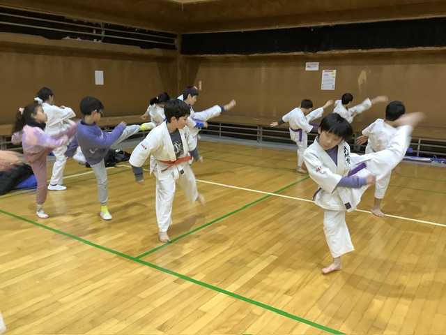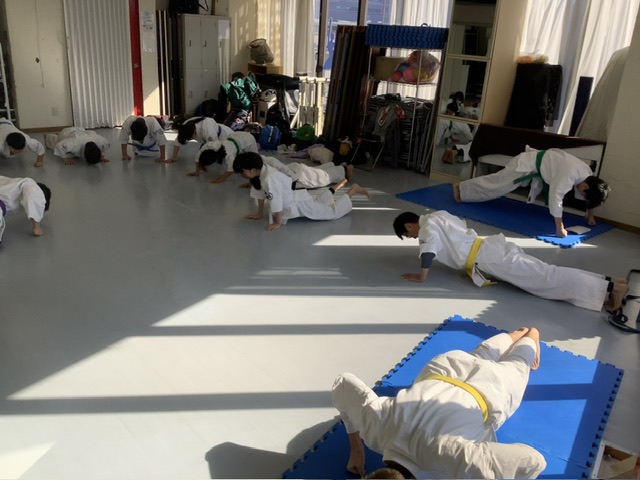 ジャンピング・スクワット後は腹筋、背筋。最後に男子は拳立て、女子は腕立て伏せで〆ました。