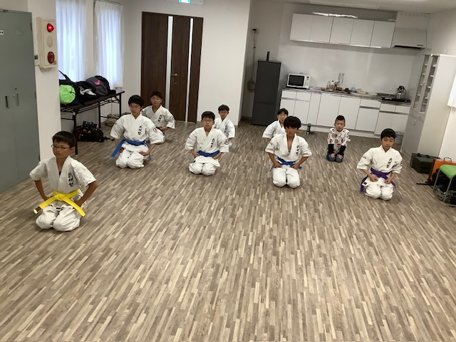 稽古直前、不動立ちで30秒動かずにじっとしていられるか?「ダルマさんが転んだ」と同じですね。子供はじっとしていられません。なので、時々やります。ユウマ君は4年生なのに挫けました。なので、事前に決めていた罰としてジャンピング・スクワットを20回です(^_-)