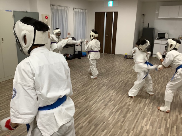 スパーリング。今日はミンハちゃんが下級生の相手を優しくします^_^ 写真の蹴りは当たらないようにコントロールしています。